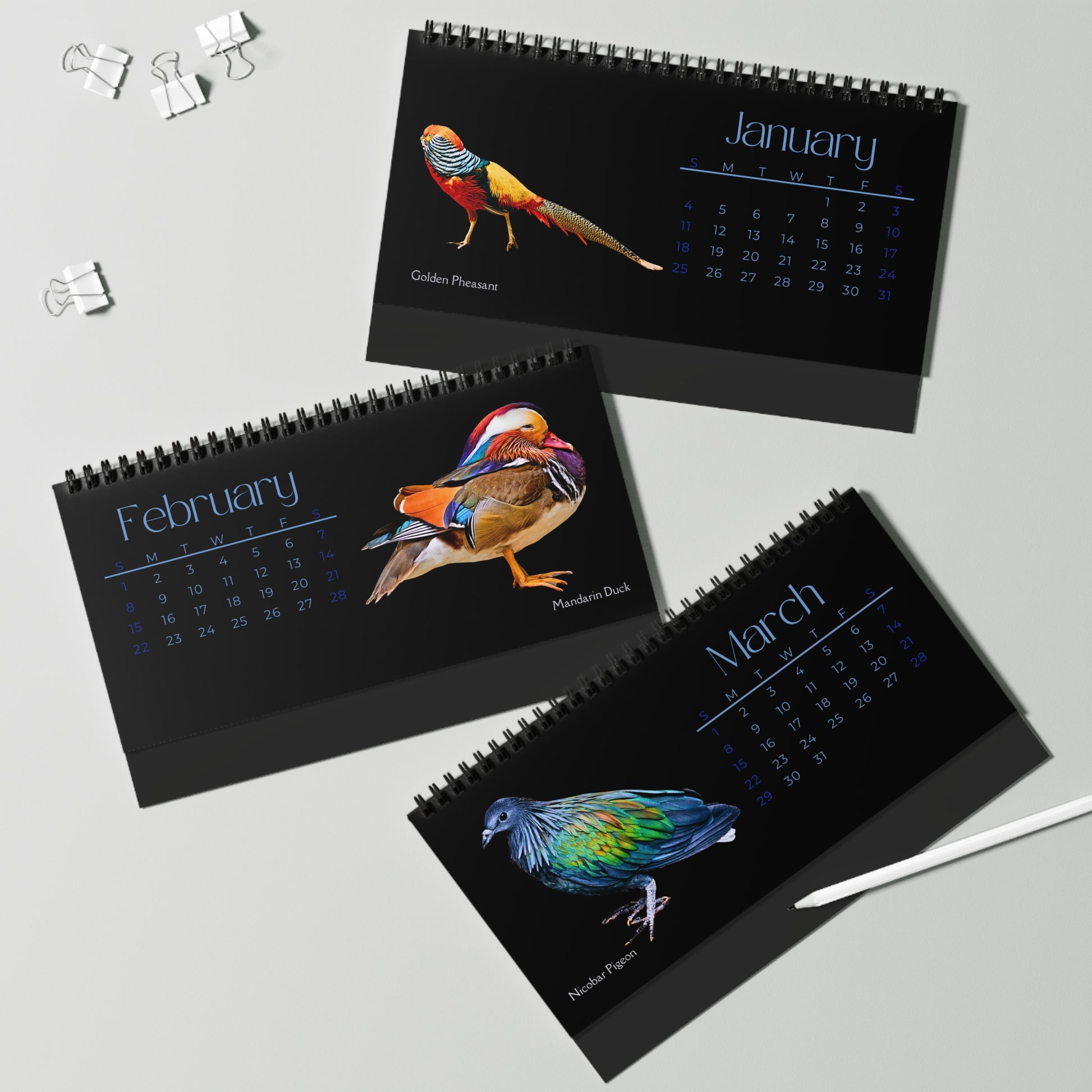 If you love bright colors and birds, this is the calendar for you. It is filled with some of the most vibrantly colored birds in the world. In addition to the painted bunting on the cover, you will find the following brilliantly colored birds: a golden pheasant, a Mandarin duck, a Nicobar pigeon, three stunning European bee-eaters, a Victoria crowned pigeon, a red crested turaco, a quetzal, a keel-billed toucan, a rainbow lorikeet, a Lady Gouldian finch, a lilac-breasted roller, and we'll finish the year with a regal looking Andean cock-of-the-rock.