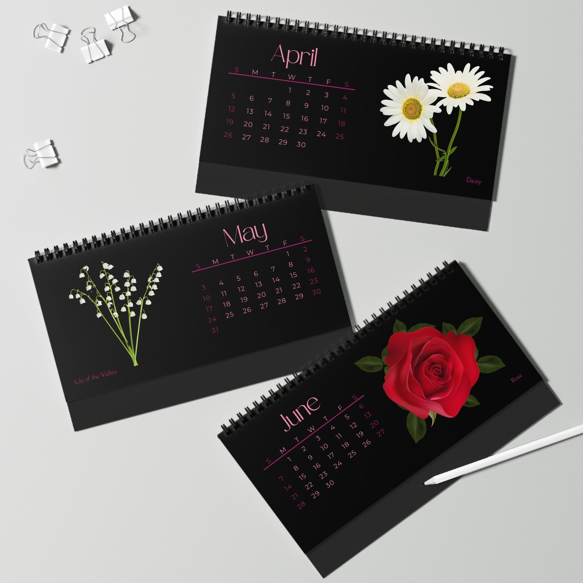 Decorate your surroundings in custom style with this Edmonds.Love exclusively designed desk calendar. Every page has a beautiful color photo of each month's birth flower. Brighten up your desk with this stunning floral calendar. Available in one size (10" x 5"), each calendar comes with high quality, 250gsm paper and a spiral bound at the top. Add your own calendar layout and bring a daily staple to life.