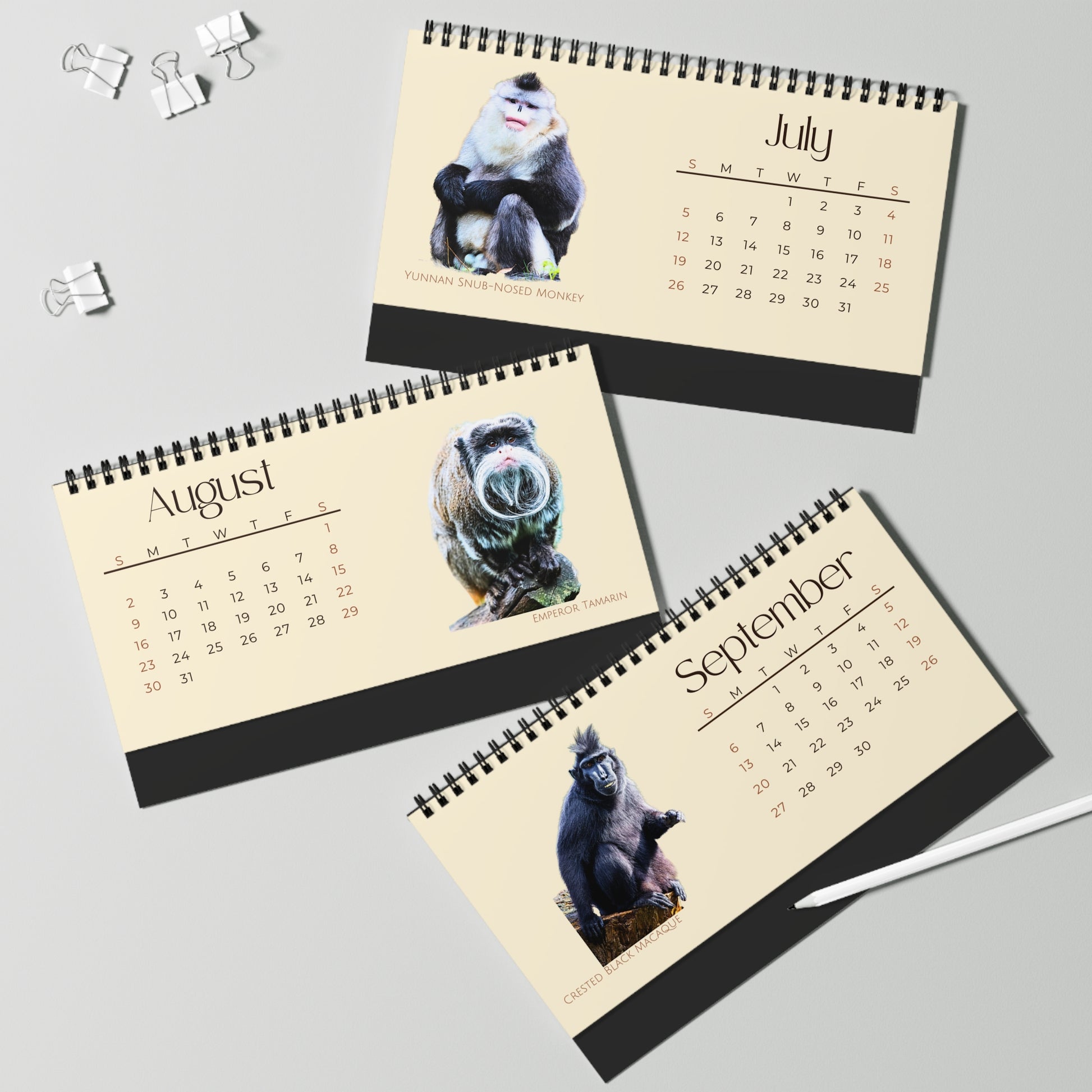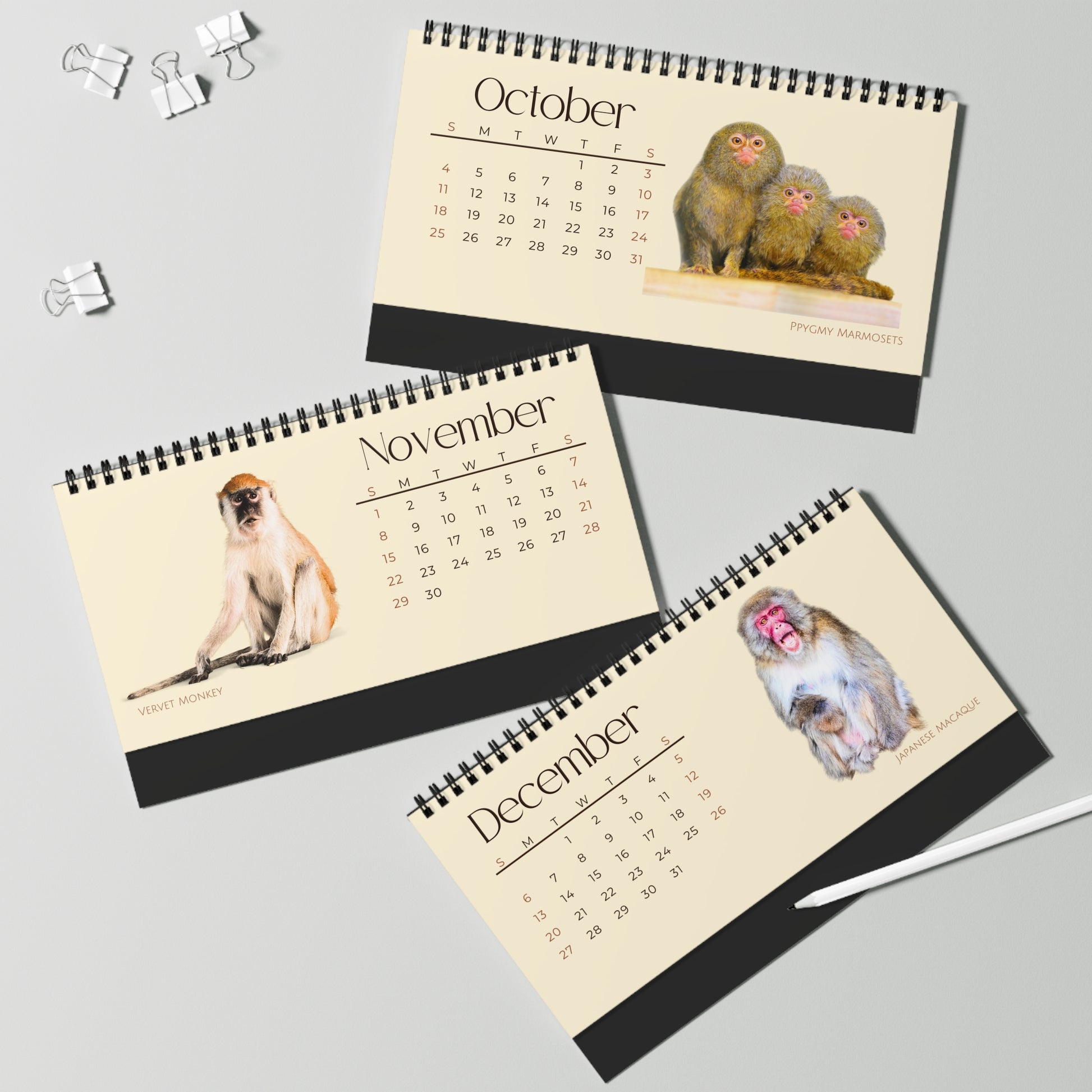 Who doesn't love a calendar full of monkeys? We have found 13 of our mightiest monkeys and put them in this calendar for you. We'll start out with a hungry slow lorin on the cover, followed by a Patas monkey (rumored to be what inspired Dr. Seuss' character, the Lorax), an owl monkey, an aye-aye, an Angolan colobus, a Philippine tarsier, a white-faced saki, Yunnan snub-nosed monkey, an emperor tamarin, a crested black macaque, a darling group of pygmy marmosets, a vervet monkey, and we'll end the year with a cheeky Japanese macaque.
